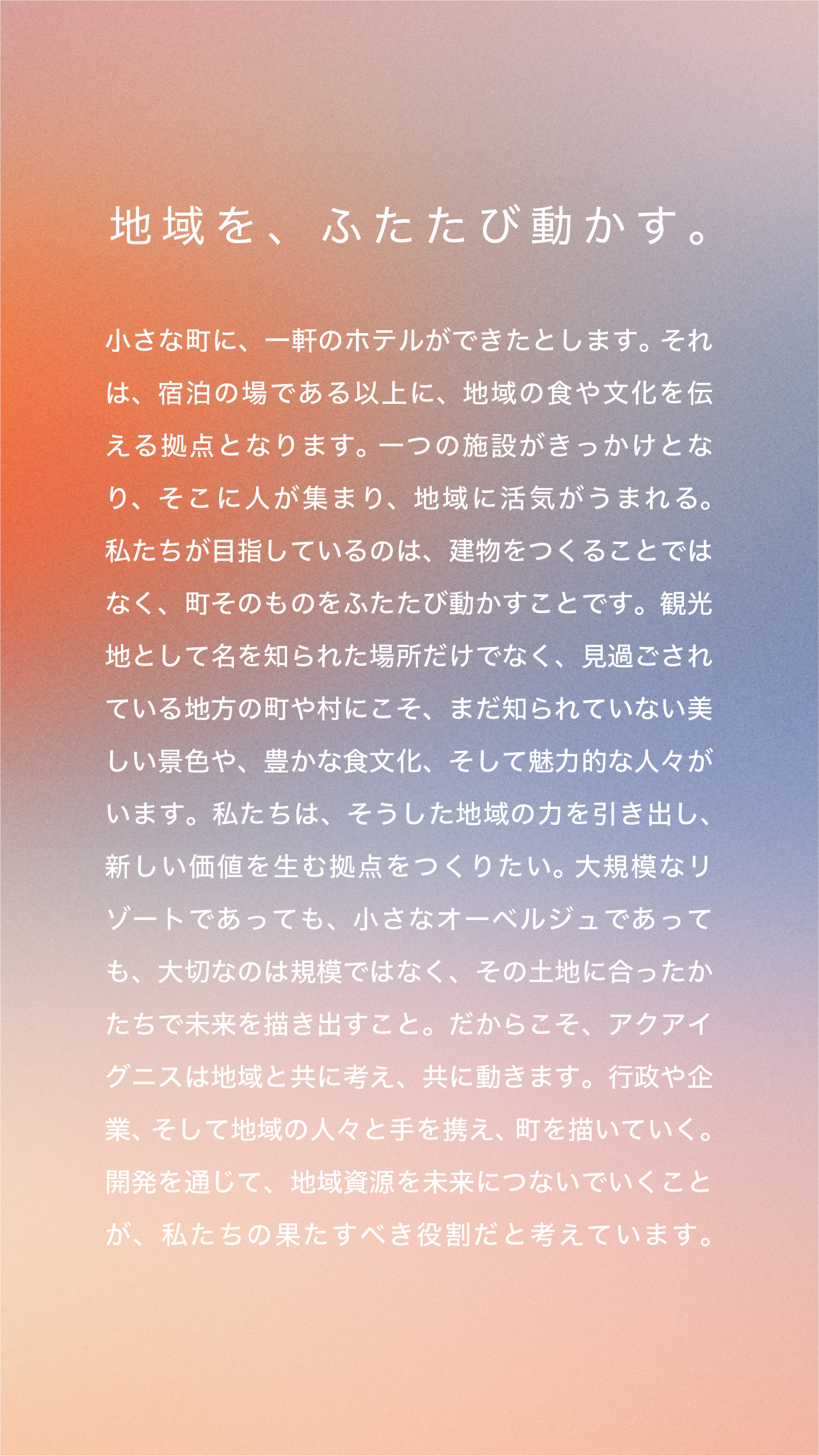 株式会社アクアイグニスは、「開発」と「運営」の2つの事業を通じて地方創生に取り組んでいます。全国各地の町や村を舞台に、開発と運営を一貫して担うことで地域価値を創出。行政・企業・住民とのパートナーシップを築きながら、その土地ならではの魅力を発掘し、地域資源のブランド化と発信につなげています。さらに、雇用創出や人材還流を促進し、地域経済とコミュニティの活性化へと広げていくことを目指しています。