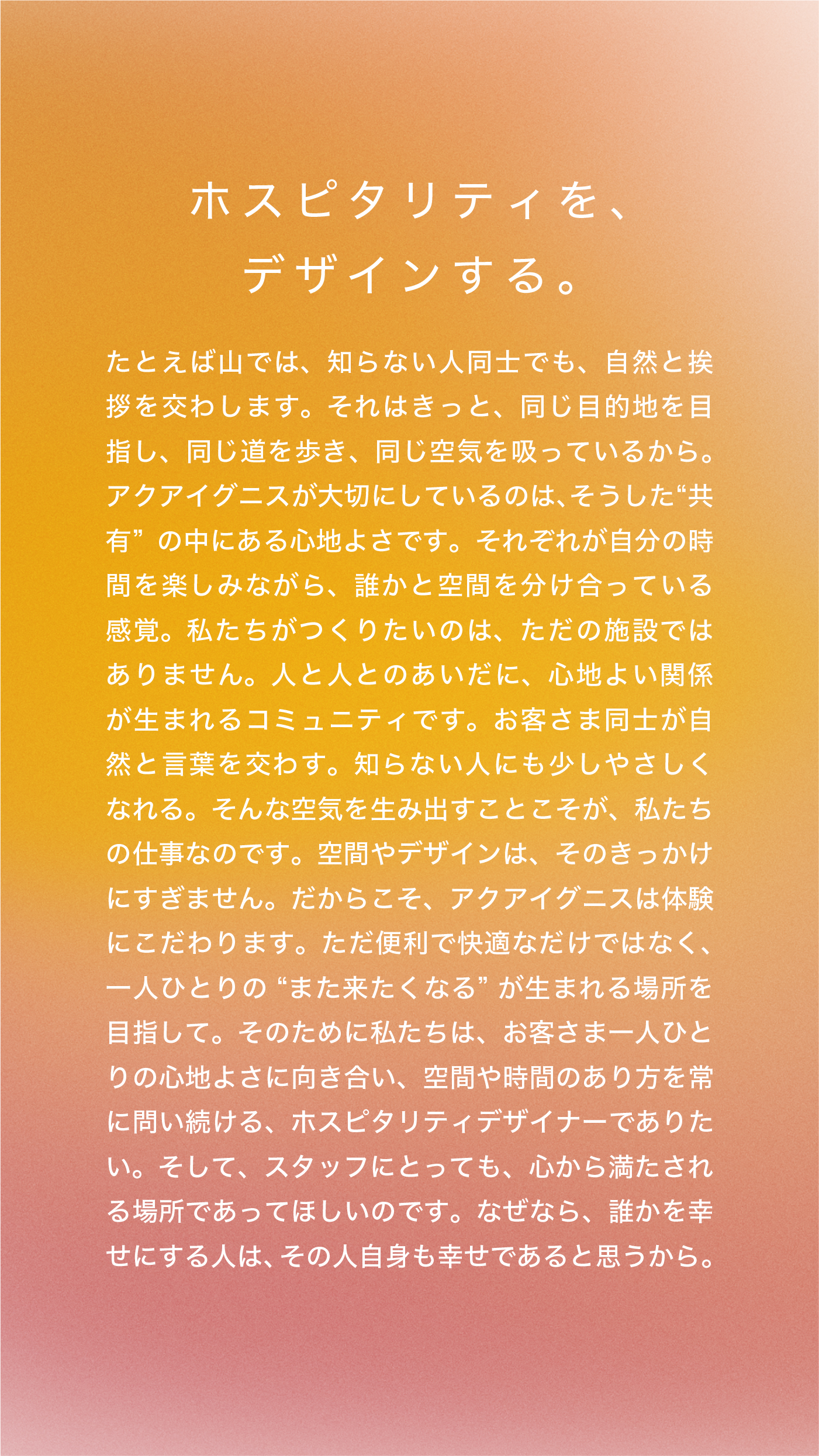 “RE:SORT” それは私たちが掲げる、新しい地方創生のかたちです。“RE:” は「再発見」「再解釈」「再構築」などの意味を、“SORT” は「選びとる」という姿勢を示しています。観光地ではない地方の町や村に眠っている食や文化、人の営みに光を当て、再解釈を加え、新しい形で未来へつないでいく。私たちが目指すのは、観光地化のための開発でも、施設運営という枠に収まるものでもありません。日本各地の町や村を「RE:SORT=もう一度見つめ直す対象」とし、そこに新しい価値を見いだすこと。それが、私たちアクアイグニスの使命です。どんな小さな町にも眠る可能性を信じ、その力を未来へとつないでいくために、私たちは挑み続けます。